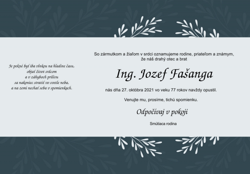 S úprimným smútkom oznamujeme, že náš priateľ, Jožko Fašanga, zakladateľ fotoklubu a dlhoročne aktívny nielen fotograf, ktorý podstatne ovplyvnil celú fotoamatérsku scénu na Slovensku, nás navždy opustil 27.októbra 2021 vo veku 77 rokov.